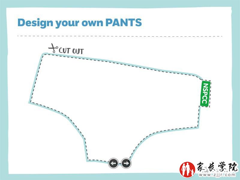 (1)“让我们聊聊内裤”的ppt文件,小朋友可以铭记PANTS这五个字母所代表的“内裤规则”,还可以打印出其中的手工游戏页,来设计自己的内裤。